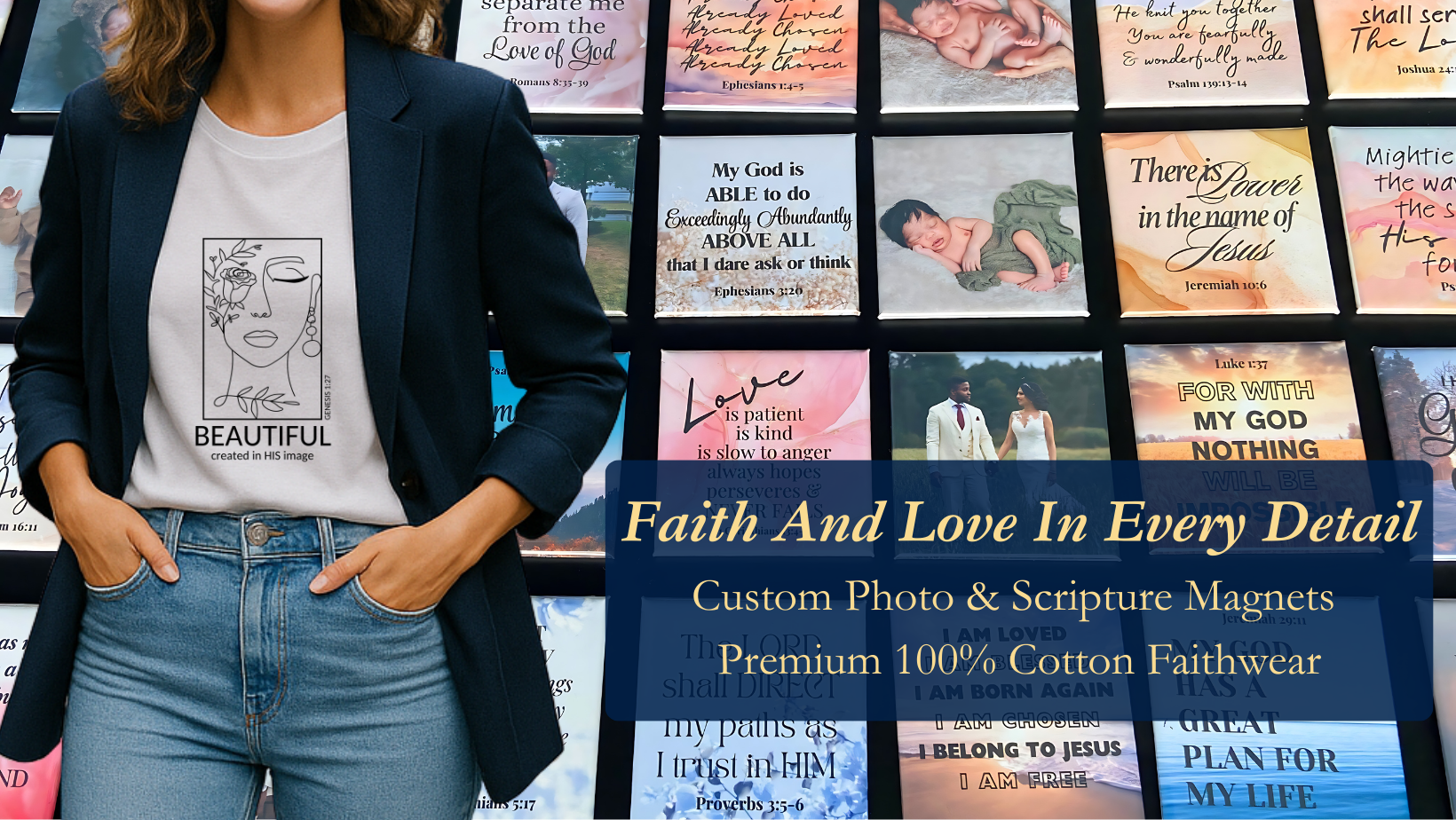 Our glossy magnets preserve your memories with vibrant quality, while our faithwear wraps you in truth and comfort with premium fabrics, and timeless Scripture-led designs.